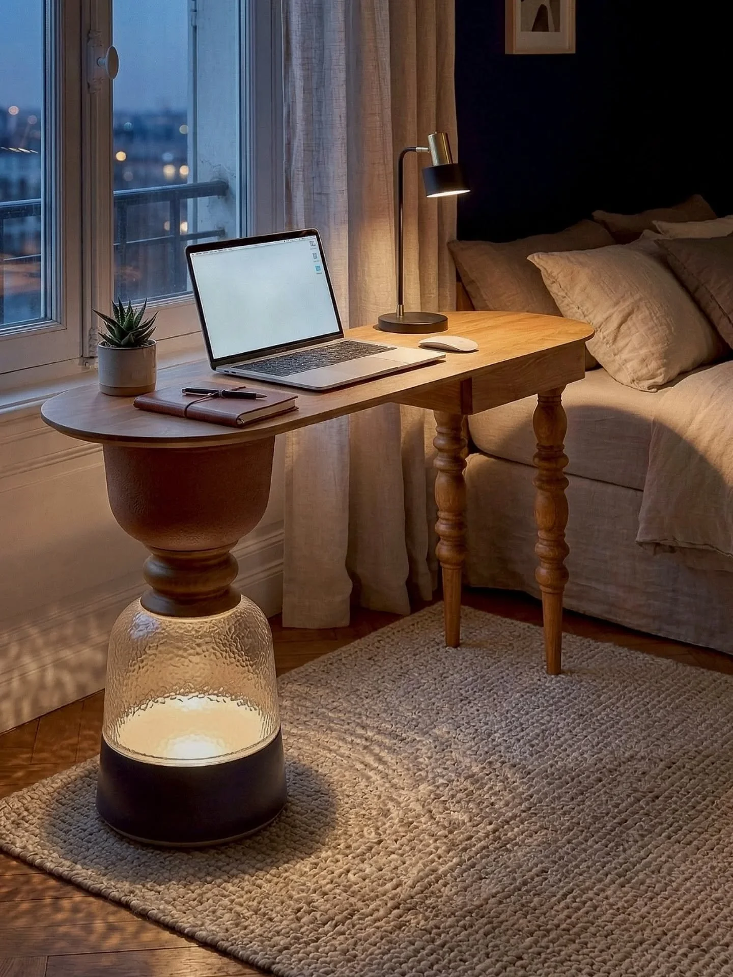 Hand-woven rice husk rattan on invisible glass — tool-free, flat-pack, and gentle to the world.